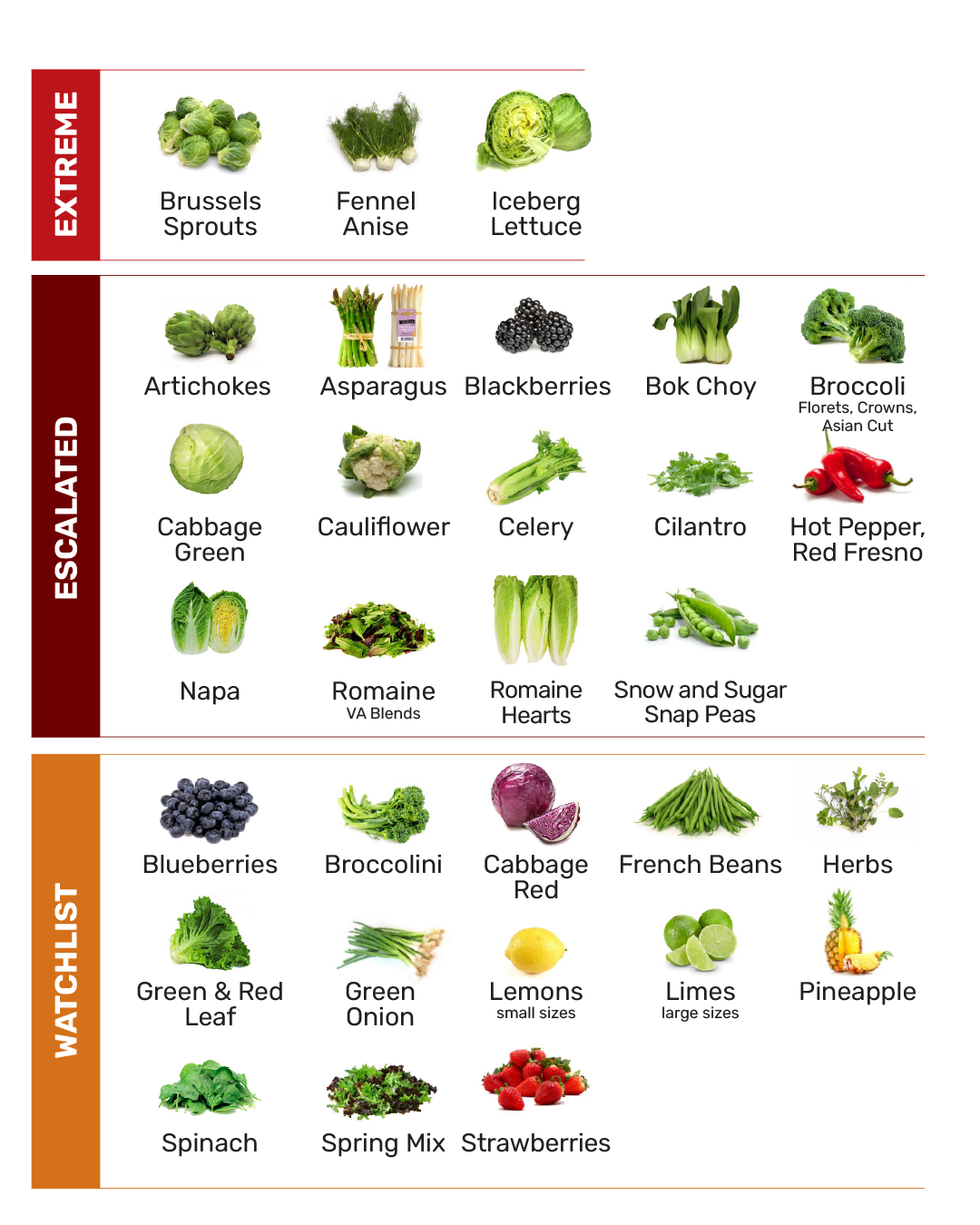 πͺππ§πππππ¦π§: Blueberries, Broccolini, Cabbage, French Beans, Herbs, Green & Red Leaf, Green Onion, Small size Lemons, Limes, Pineapple, Spinach, Spring Mix, Strawberries