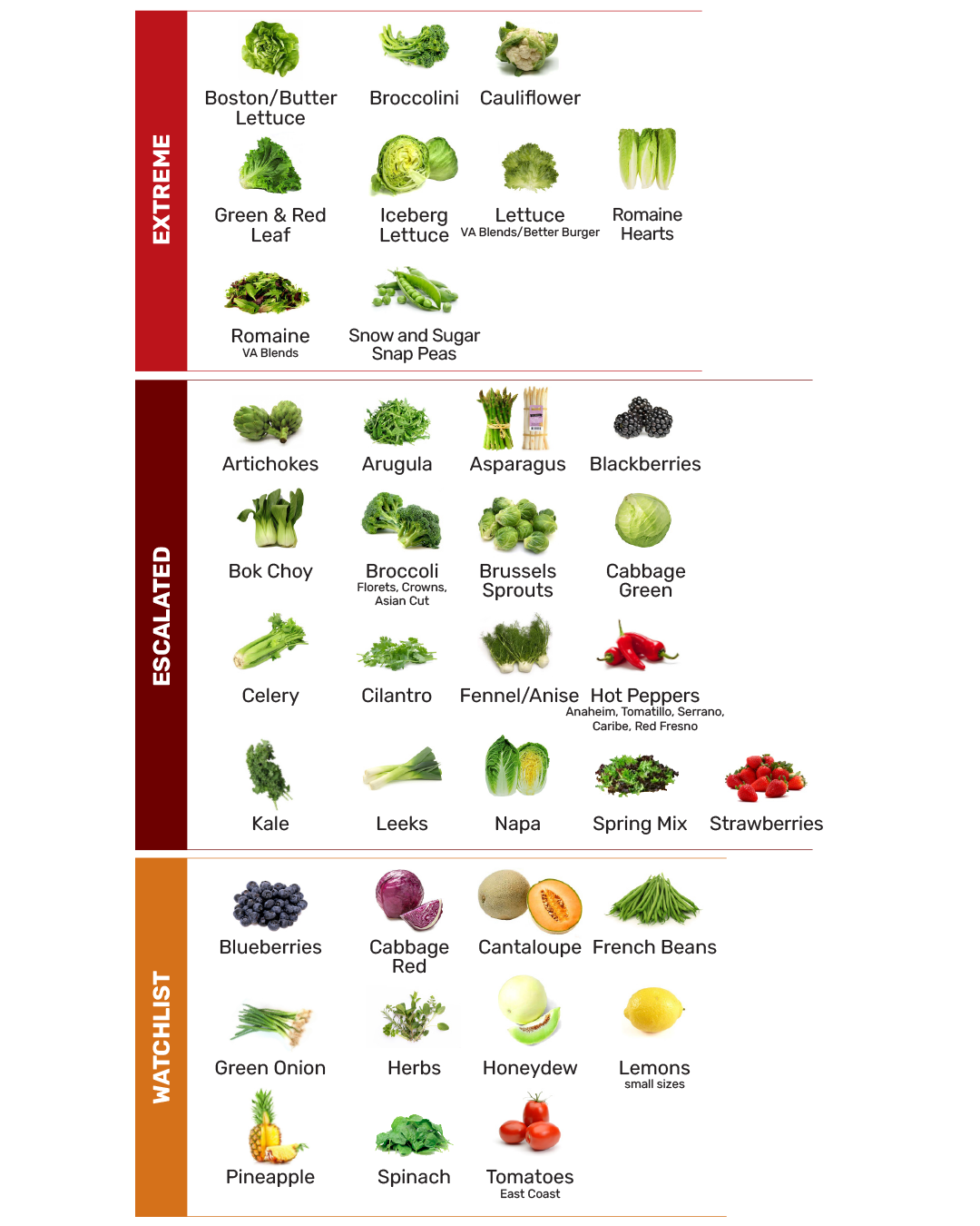 𝗘𝗦𝗖𝗔𝗟𝗔𝗧𝗘𝗗: Artichokes, Arugula, Asparagus, Blackberries, Bok Choy, Broccoli, Brussels Sprouts VA, Cilantro, Fennel/Anise, Green Beans, Green Onion, Hot Peppers, Leeks, Napa, Spring Mix, Tomatoes