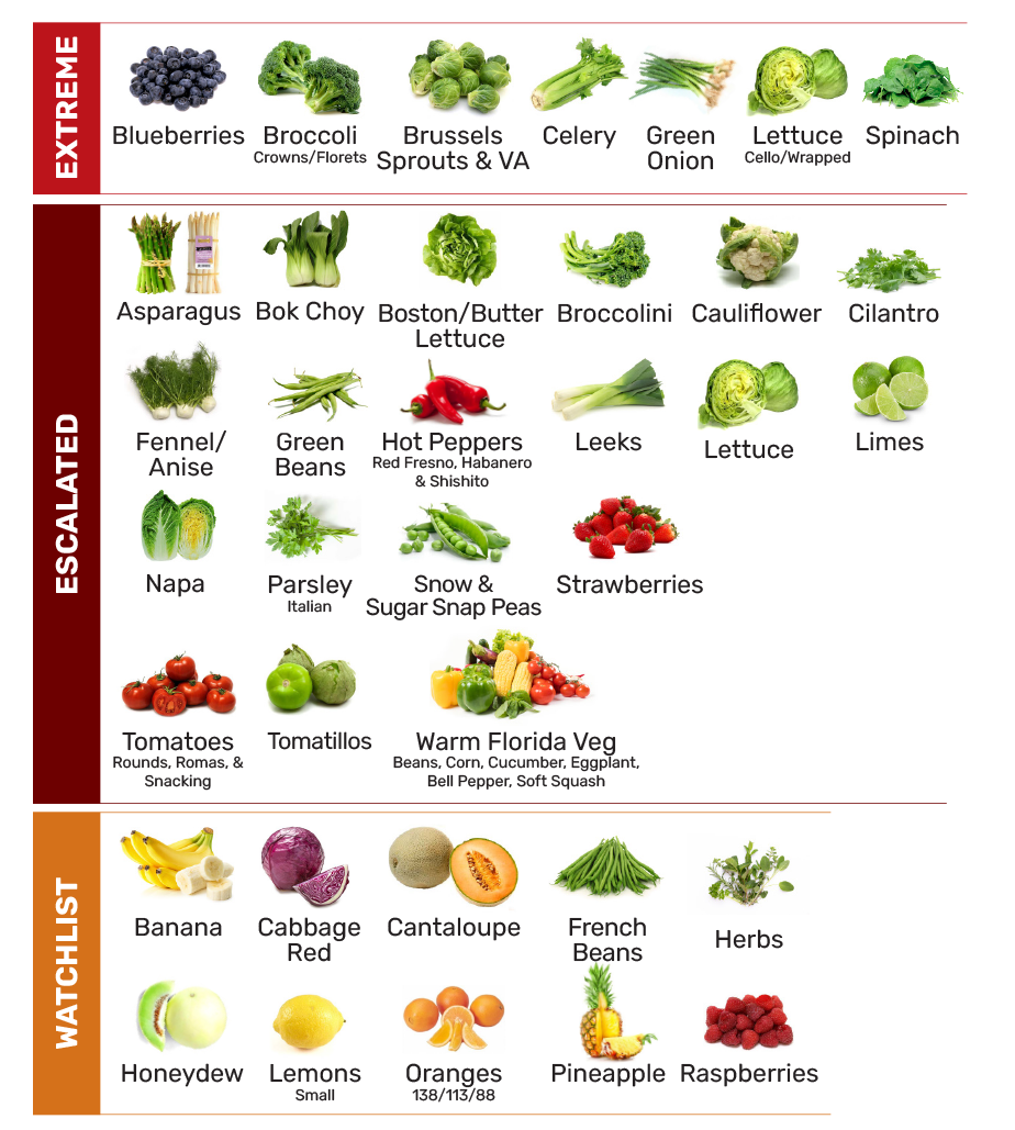 𝗘𝗦𝗖𝗔𝗟𝗔𝗧𝗘𝗗: Asparagus, Bok Choy, Boston/Butter Lettuce, Broccolini, Cauliflower, Cilantro, Fennel/Anise, Green Beans, Hot Peppers, Leeks, Lettuce, Limes, Napa, Parsley, Snow & Sugar Snap Peas, Strawberries, Tomatillos, Tomatoes and Warm Florida Veg.