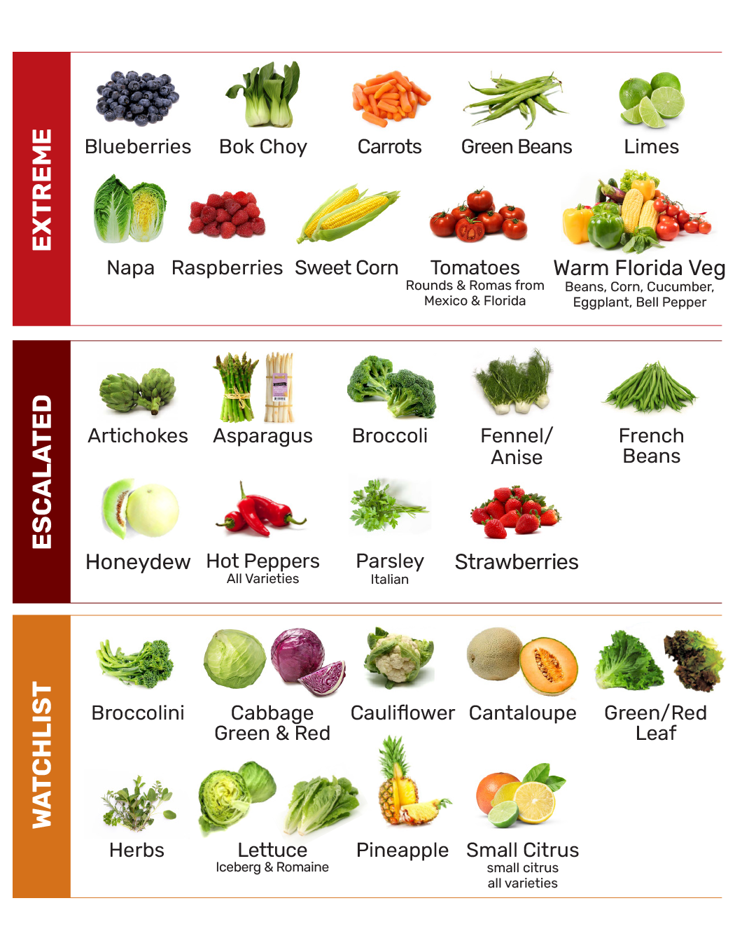 𝗘𝗫𝗧𝗥𝗘𝗠𝗘: Blueberries, Bok Choy, Carrots, Green Beans, Limes, Napa, Raspberries, Sweet Corn, Tomatoes, & Warm Florida Vegetables.